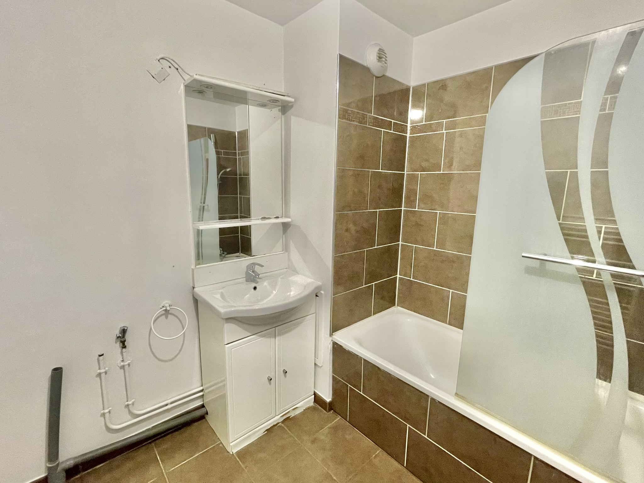 Une salle de bains avec branchement machine à laver et sèche-serviette,